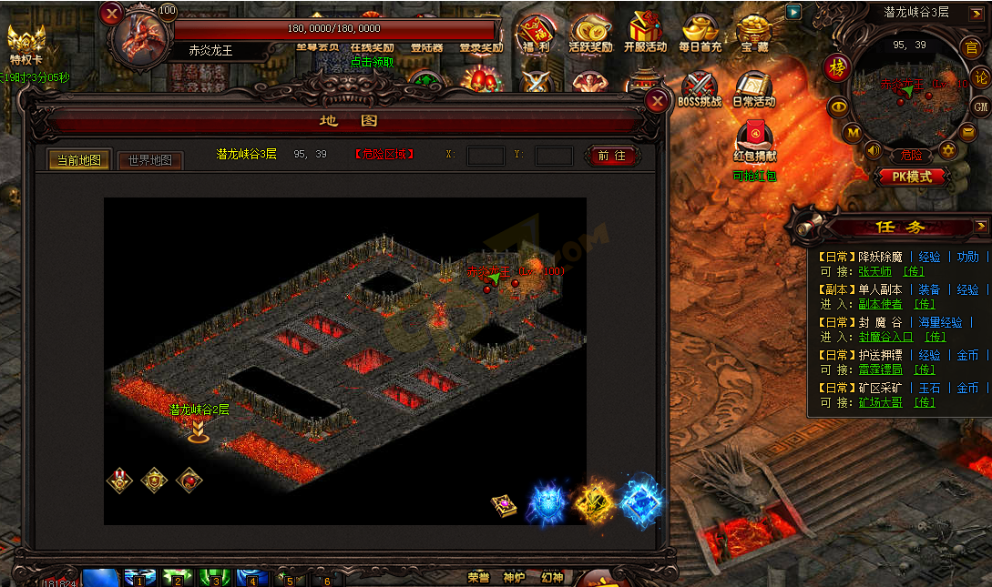 雷霆之怒潜龙峡谷共3层,玩家通过传送功能,默认进入是在第1层任意位置。潜龙峡谷地图每层都布满各种小怪,这些小怪主要有炎金魔、赤岩兽、炎烈鸟、刀炎兵等小怪,而第三层还有一只boss“赤炎龙王”,玩家击杀该boss会掉落80级以下的各职业套装,甚至还会掉落其他有用的材料的。