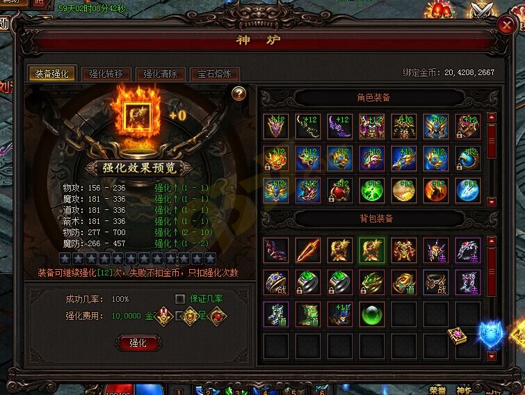 强化+12:成功几率为3%,使用12125元宝保证几率100 %。