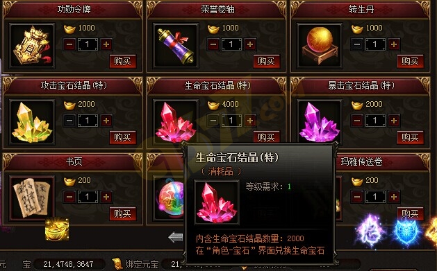 大家平时打boss或下副本,都是无法见到生命宝石结晶(特)。你要想获得生命宝石结晶(特),可在商城里花费元宝购买,每个生命宝石结晶(特)4000元宝,也可以利用历练积分兑换,每个生命宝石结晶(特)消耗4000点历练积分。大家还可以使用宝藏积分(或boss积分)兑换,每个生命宝石结晶(特)消耗48点宝藏积分(或4000点boss积分)。