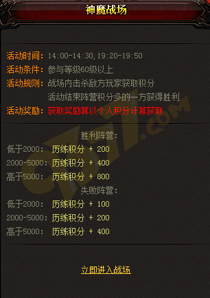 3、活动介绍:神魔战场开启后,玩家可以通过在兽人山寨神魔战场NPC(108、88)进入,玩有随机分配阵营,活动中击杀敌对阵营玩家可以获得相应积分,活动结束时阵营积分多的一方获得胜利,双方玩家都获得杀敌积分所对应的大量历练积分。
