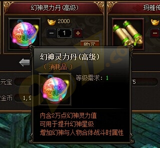进入商城的成长变强栏,有幻神灵力丹(高级)购买,每颗售价为2000元宝;而在绑定元宝栏,也可以花费10000绑定元宝购买。