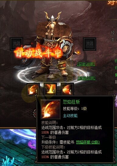 怒焰狂斩(1级):近战范围攻击,对前方2格目标造成100%的普通伤害;