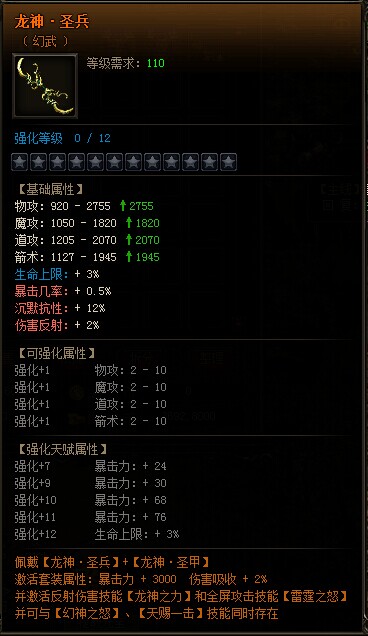 1、佩戴【龙神•圣兵】+【龙神•圣甲】后,激活套装属性:暴击力+3000、伤害吸收+2%