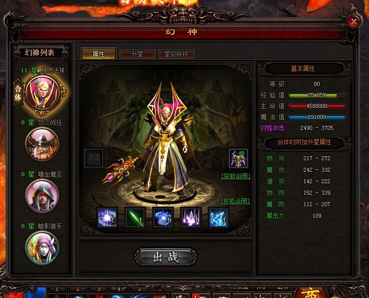 玩家成功激活精灵法神时,可以通过提升精灵法神等级、升星、佩戴幻神灵器等功能,提升其战斗力。当人物佩戴龙陨或龙帝套装,并且幻神佩戴天怒套装时,还能激活神技幻神之怒技能,该技能具有火焰灼烧、冰冻减速、沉默三大效果。