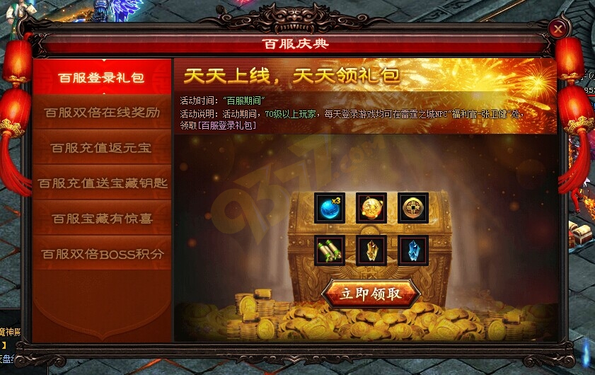 雷霆之怒百服登陆礼包是百服期间的一种免费礼包,玩家只要等级达到70级或以上,在百服期间,天天坚持上线,天天都能领取1份百服登陆礼包。雷霆之怒百服登陆礼包领取方法,可从界面上方的“百服庆典”图标进入去领取,或者到雷霆之城找npc“福利官-张卫健”去领取。
