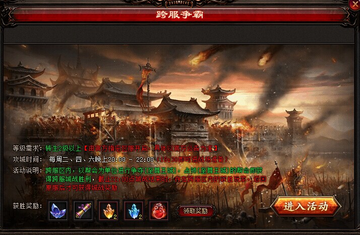 7、跨服奖励,在截止22:00城战结束时,存在于跨服区内的获胜方玩家,返回原服后可在NPC“跨服战入口”处,领取跨服战获胜奖励,失败方无任何奖励